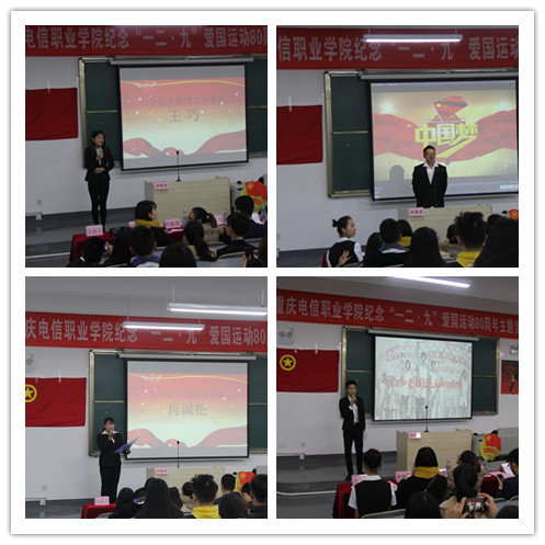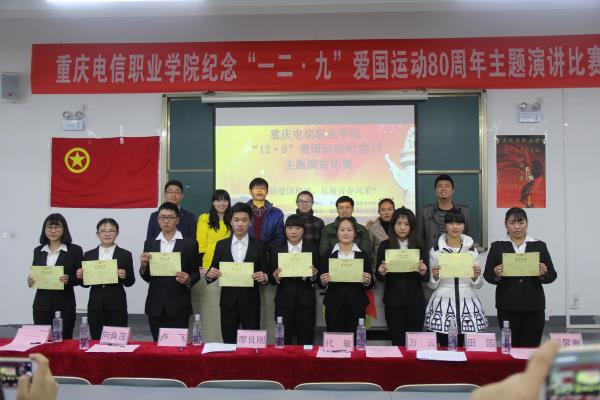 为响应校党委号召,认真贯彻十八届五中全会精神,弘扬爱国之志,展现电信学子高昂的精神风貌。12月9日,由校团委主办,学生联合会承办的“弘扬爱国精神、尽展青春风采”之纪念“12•9运动”80周年主题演讲比赛在龙水湖校区和星湖校区分别举行。学校相关职能部门领导、各二级学院团总支书记、辅导员,2014、2015级学生代表到场观看了比赛。经过选手们的激烈角逐,最终,管理工程学院王巧同学和校团委刘丹莉同学分别获得两校区第一名。