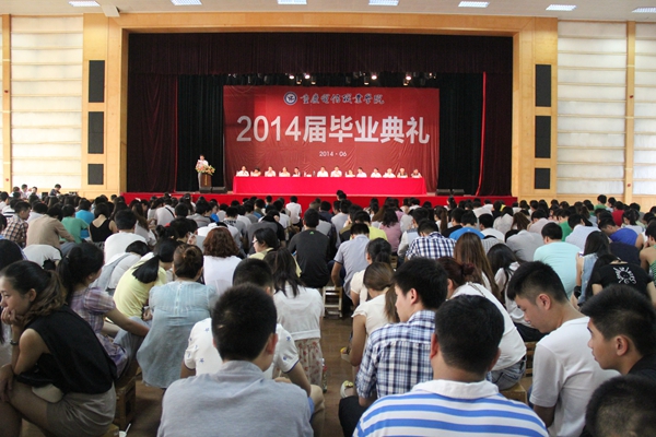 毕业典礼在庄严的国歌声中拉开序幕。首先,作为2014届毕业生代表,电信商务2班的学生李小梅代表全体毕业生在发言中感谢了三年来给予教导、关心的母校和老师。随后,2013级艺术工程系的吴灏?同学、何宜老师分别代表非毕业生以及全体教师做了热情洋溢的发言,表达了对2014届全体毕业生热烈祝贺和美好祝愿。