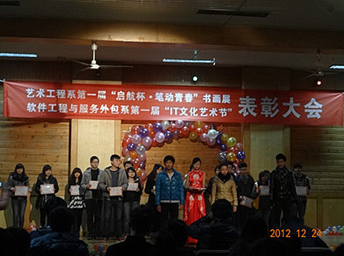近日,KY开元软件工程与服务外包系和艺术工程系联合举办的 “第一届IT文化艺术节”、“起航杯·笔动青春书画展” 暨表彰大会元旦舞会在活动中心三楼隆重举行。学校副书记白成良、学生处副处长杨福元、艺术工程系主任吴彪和对外合作处谈建设处长等应邀出席。校内各部门和各系的老师和同学们一起观看演出,吴彪主任发表了热情洋溢的新年贺辞。