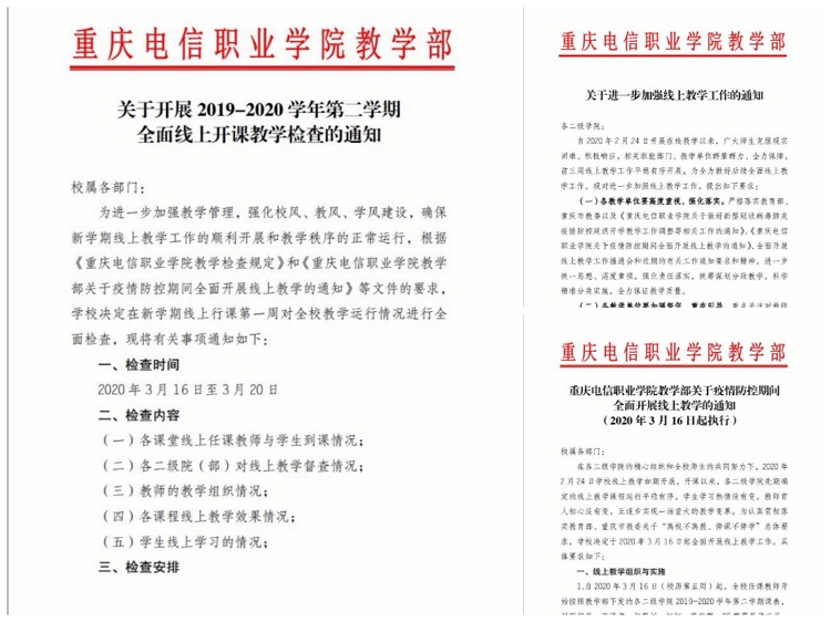 同时,为确保全面线上教学工作顺利开启,教学部发布了《KY开元集团官网关于开展2019-2020学年第二学期线上开学教学检查的通知》,并由全体校领导、各二级学院党政领导和相关职能部门负责人组成了综合检查组,对KY开元开展全面线上教学工作进行了专项检查。检查组成员深入各类教学平台,对线上教学的教学组织、线上教学资源准备及利用、线上教学的管理和要求、线上教学的师生互动、学习效果等进行了检查,详细了解教师的教学情况和学生的学习状况,填写《KY开元集团官网线上听课记录表》,并主动与教师交流或交换意见,为提高教学质量打好基础。各二级院也对本单位的教学情况进行了自检自查,并认真填写提交《重庆电信职业职业线上教学检查记录表》以及《KY开元集团官网线上教学情况巡查记录表》。
