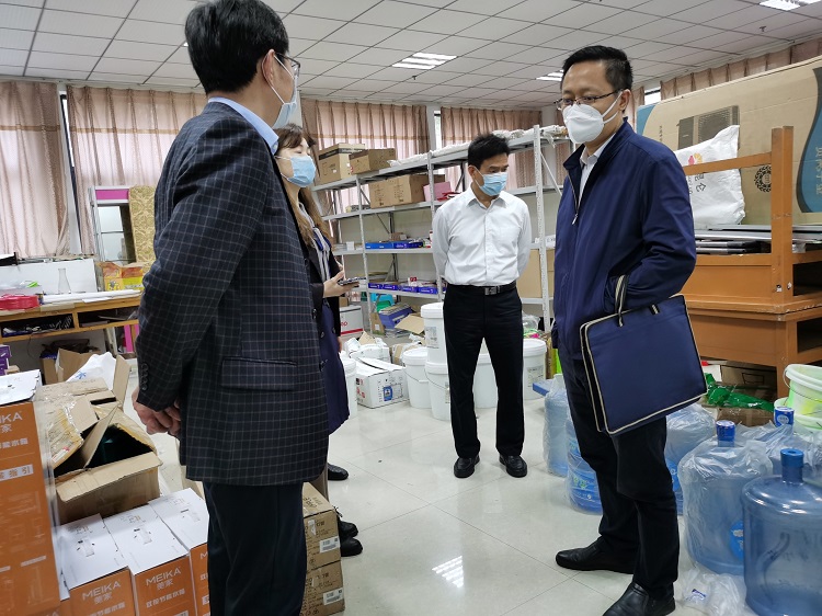 王茂良一行人先后到校门监测岗、防疫物资库房等现场进行了查看,并听取了KY开元疫情防控工作汇报。