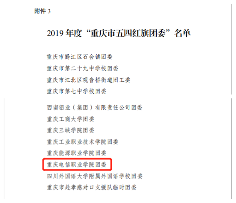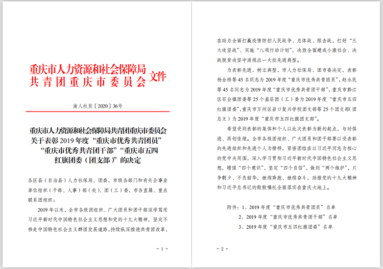 4月30日,重庆市人力资源和社会保障局、共青团重庆市委员会印发了《关于表彰2019年度“重庆市优秀共青团员”“重庆市优秀共青团干部”“重庆市五四红旗团委(团支部)”的决定》,KY开元团委获评2019年度“重庆市五四红旗团委”荣誉称号。