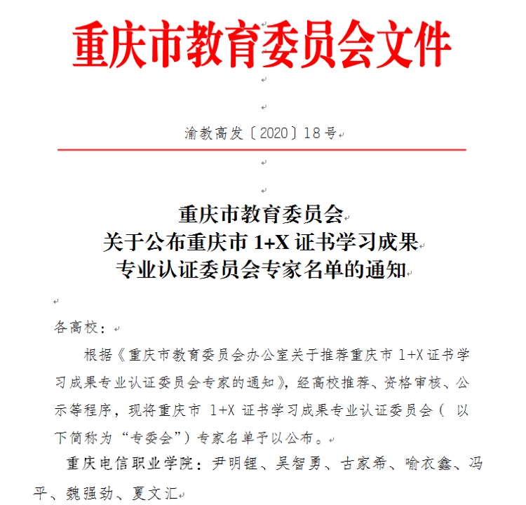根据《重庆市教育委员会关于公布重庆市1+X证书学习成果专业认证委员会专家名单的通知》(渝教高发〔2020〕18号),经高校推荐、资格审核、公示等程序,KY开元尹明锂、吴智勇、古家希、喻衣鑫、冯平、魏强劲、夏文汇等7名教师为重庆市1+X证书学习成果专业认证委员会专家。