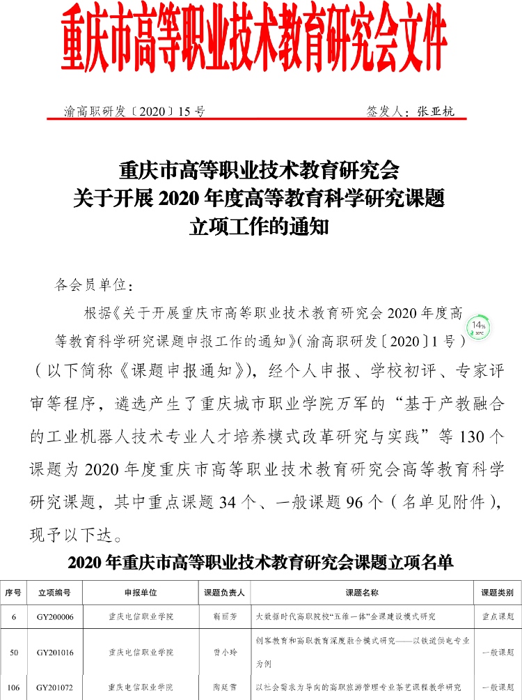 近日,从《重庆市高等职业技术教育研究会关于开展 2020 年度高等教育科学研究课题立项工作的通知》渝高职研发﹝2020﹞15 号文件中获悉,KY开元靳丽芳、陶廷雪、曾小玲三位老师申报的课题成功立项。其中重点课题1项,一般课题2项。