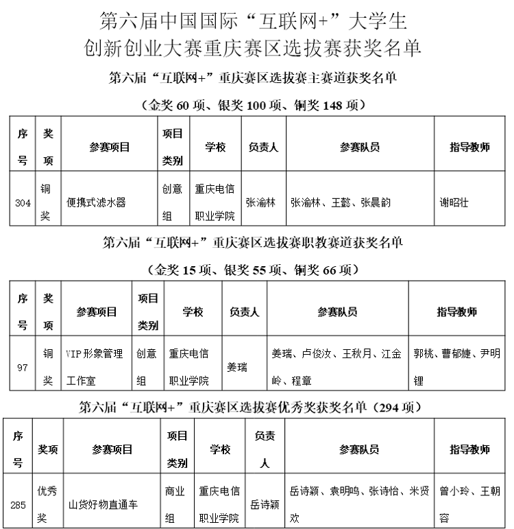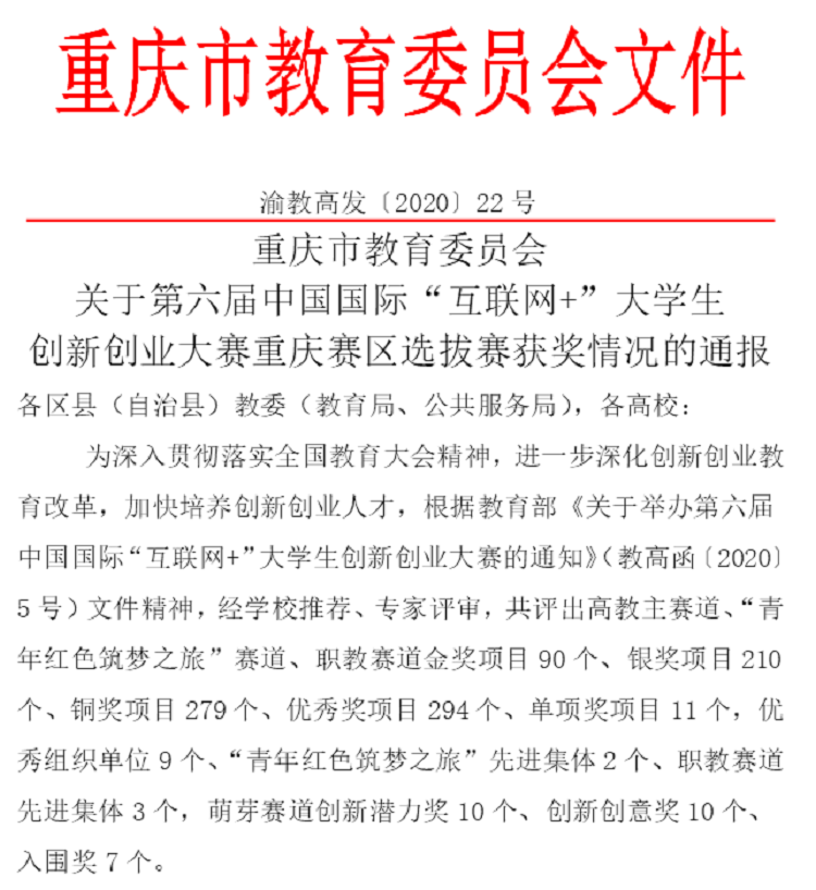 在第六届中国国际“互联网+”大学生创新创业大赛重庆赛区中,共评出高教主赛道、“青年红色筑梦之旅”赛道、职教赛道金奖项目90个、银奖项目210个、铜奖项目279个、优秀奖项目294个、单项奖项目11个,优秀组织单位9个、“青年红色筑梦之旅”先进集体2个、职教赛道先进集体3个,萌芽赛道创新潜力奖10个、创新创意奖10个、入围奖7个。