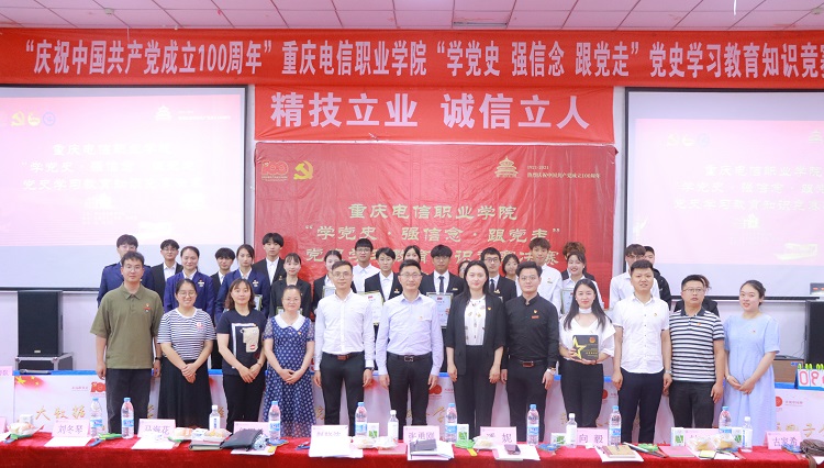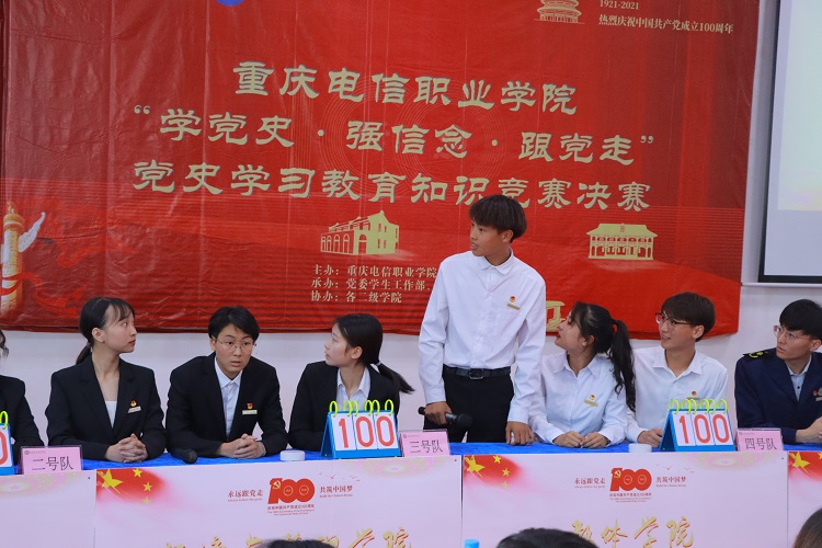 本次知识竞赛分学院初赛和校级决赛两部分,各位参赛选手通过学院层层选拔,最终入围校级决赛。在决赛环节中,竞答方式融问答、竞技、互动等形式于一体,包括必答题、抢答题、风险题等多种题型,设置了观众抢答等互动环节,系统考察了参赛选手们的“党史”学习爱教育成果,也对观众进行了一场别开生面的“党史”知识教育。现场各参赛选手结合所学,踊跃抢答,比分你追我赶,观众积极互动,场内气氛热烈。最终,经济与管理学院获得一等奖和最佳组织奖,大数据与软件学院、初等教育学院荣获二等奖,教体学院、人工智能与电子学院、轨道交通学院、物联网与通信学院荣获三等奖。