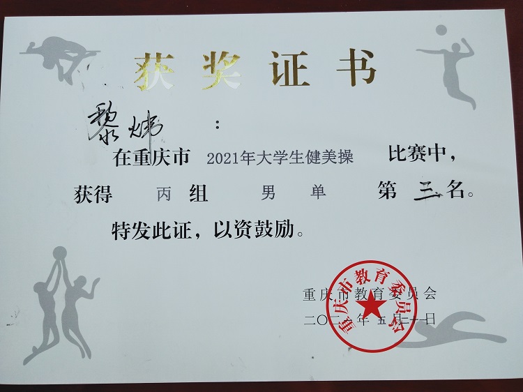 旅游与体育学院经过前期的筛选,选派出5名学生代表参加本次比赛,均获优异成绩;经过四天的激烈比拼,KY开元健美操代表队,与多所本科体育专业院校同台竞技中,男单竞技健美操丙组第三名;获得三人竞技健美操丙组第四名,女子单人竞技丙组第五的优异成绩。带队教师尤良熟在比赛中被评为优秀教练员称号!