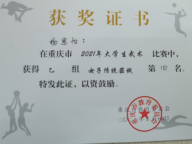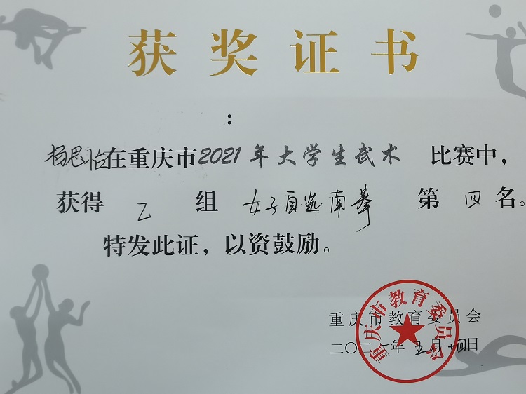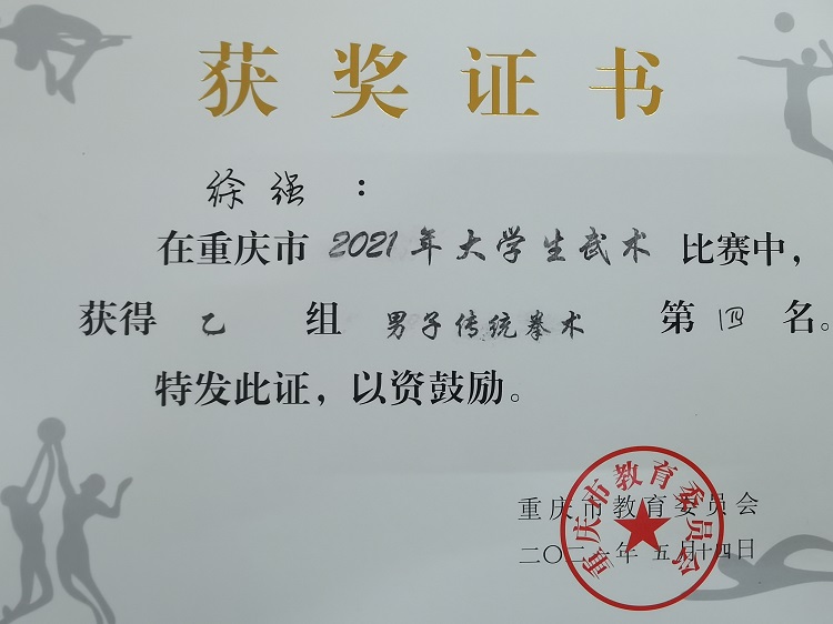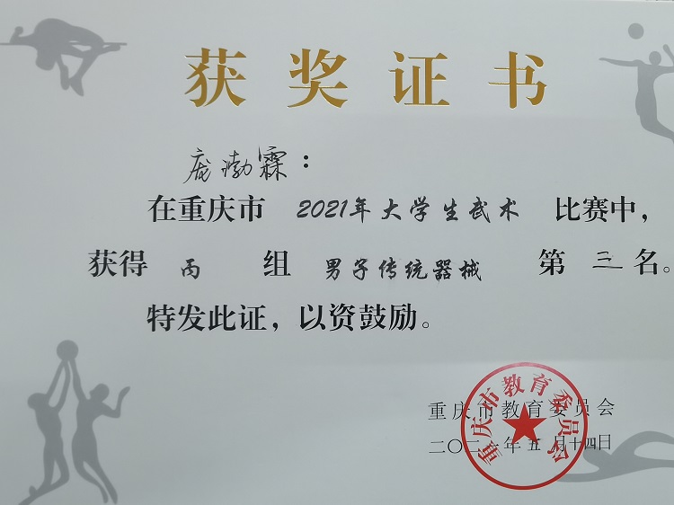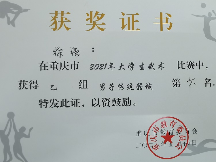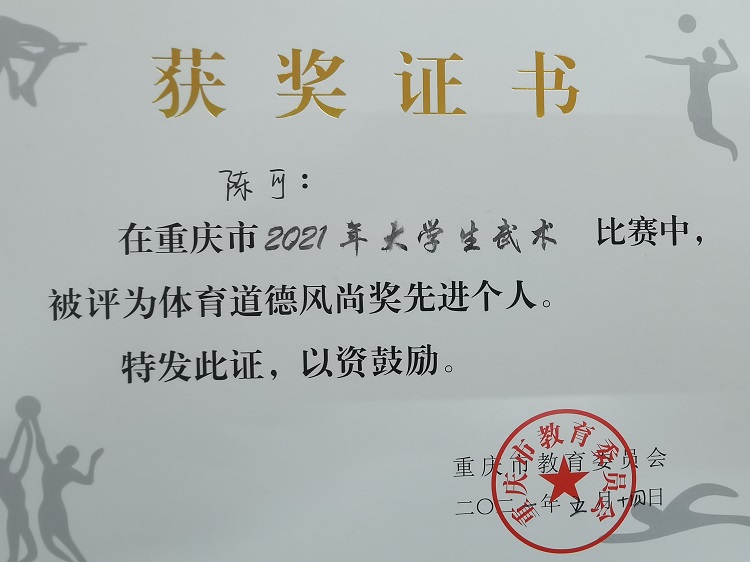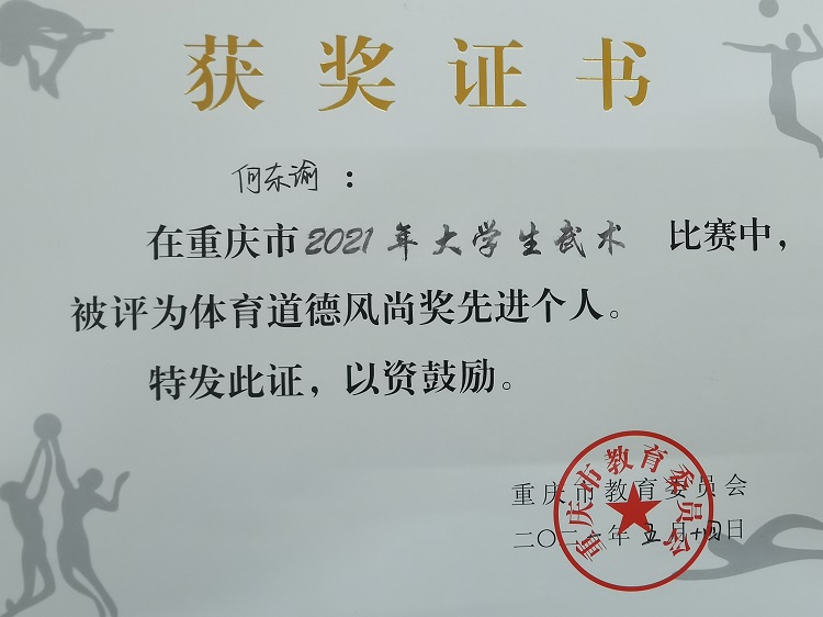 何东渝、陈可两名队员获得2021年重庆市大学生武术比赛“体育道德风尚奖先进个人”荣誉称号!