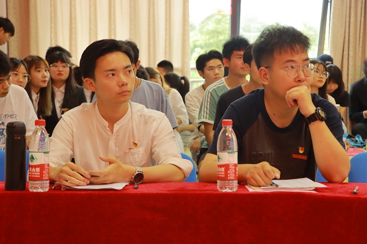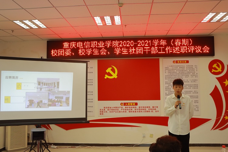 本次述职评议由各部门学生干部在前一天线上抽签环节抽到的顺序依次上台进行述职,从自我介绍、工作成果、工作优缺、工作展望等方面进行了述职报告的汇报。各位老师与各学生代表认真听取并及时记录述职内容,在听取完每一位述职之后依序进行了打分。
