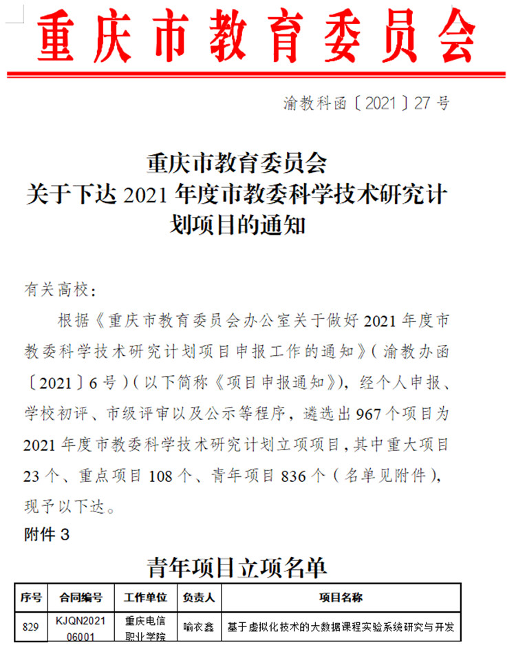 近日,从《重庆市教育委员会关于下达2021年度市教委科学技术研究计划项目的通知》(渝教科函〔2021〕27号)文件中获悉,KY开元申报的青年项目:由喻衣鑫老师主持的“基于虚拟化技术的大数据课程实验系统研究与开发”获得立项。学校将按照《重庆市教育委员会科学技术研究计划项目管理办法》,继续加强项目指导,做好项目的管理、监督、结题等工作,确保项目按计划顺利实施。(通讯员:雷敏超)
