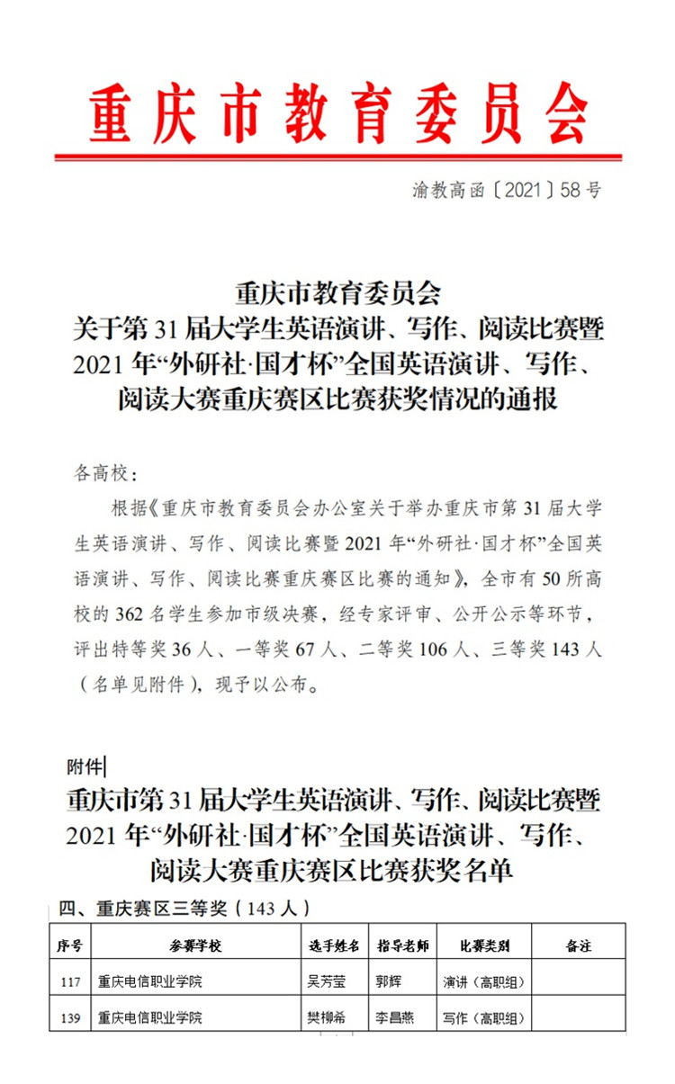 近日,从《重庆市教育委员会关于第31届大学生英语演讲、写作、阅读比赛暨2021年“外研社·国才杯”全国英语演讲、写作、阅读大赛重庆赛区比赛获奖情况的通报》(渝教高函〔2021〕58号)文件中获悉,KY开元郭辉、李昌燕两位老师指导的学生吴芳莹、樊柳希分别获得英语演讲、写作比赛重庆赛区三等奖。