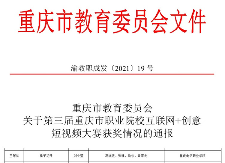 近日,《重庆市教育委员会关于第三届重庆市职业院校互联网+创意短视频大赛获奖情况的通报》(渝教职成发〔2021〕19号)文件发布,KY开元荣获第三届重庆市职业院校互联网+创意短视频大赛三等奖。