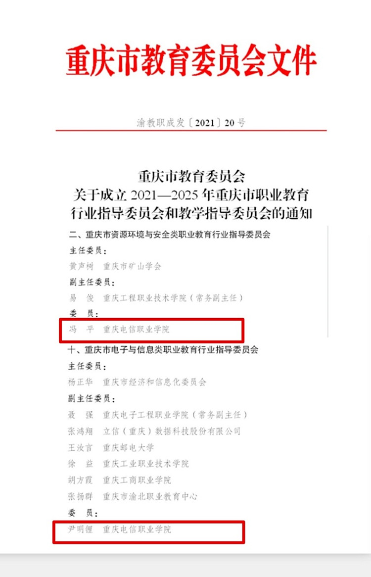 日前,重庆市教育委员会下发《重庆市教育委员会关于成立2021—2025年重庆市职业教育行业指导委员会和教学指导委员会的通知》(渝教职成发〔2021〕20号)。KY开元物联网与通信学院院长尹明锂以及大数据与软件学院院长冯平入选重庆市职业教育行业指导委员会委员名单。