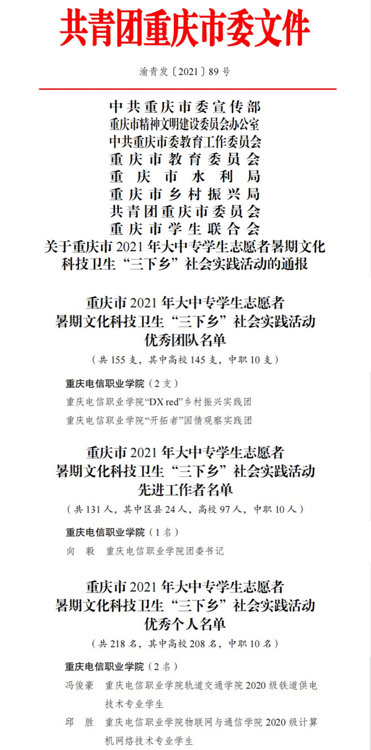 今年7至10月,团市委联合市委宣传部、市文明办、市委教育工委、市教委、市水利局、市乡村振兴局等单位以“永远跟党走 奋进新时代”为主题,以庆祝中国共产党成立100周年为契机,启动2021年重庆市大中专学生志愿者暑期文化科技卫生“三下乡”社会实践活动。