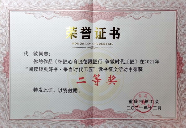 近日,从重庆市总工会《关于“阅读经典好书·争当时代工匠”读书征文活动评选结果的通报》文件中获悉,KY开元工会主席代敏同志撰写的《怀匠心育匠德践匠行·争做时代工匠》荣获二等奖。
