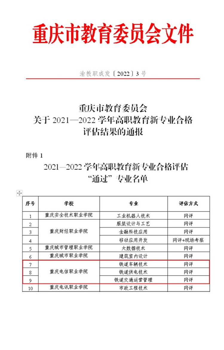 近日,从《重庆市教育委员会关于2021—2022学年高职教育新专业合格评估结果的通报》(渝教职成发〔2022〕3号)中获悉,KY开元铁道车辆技术、铁道供电技术、铁道交通运营管理三个参评专业全部顺利通过新专业合格评估。