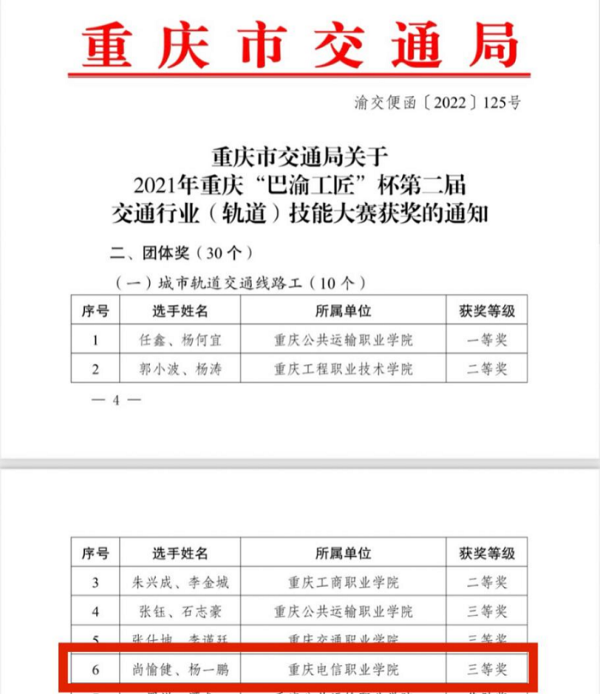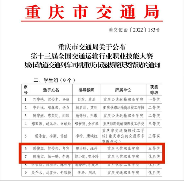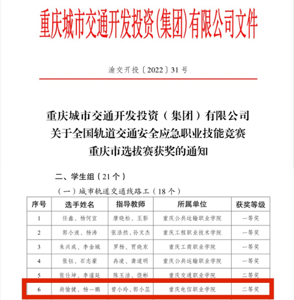 轨道交通学院学子在重庆市交通局联合市人社局组织开展的2021年重庆“巴渝工匠”杯第二届交通行业(轨道)技能大赛、重庆市交通局组织开展的第十三届全国交通运输行业职业技能大赛城市轨道交通列车司机重庆地区选拔赛、重庆城市交通开发投资(集团)有限公司举办的全国轨道交通安全应急职业技能竞赛重庆选拔赛,三项大赛中荣获佳绩。