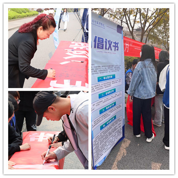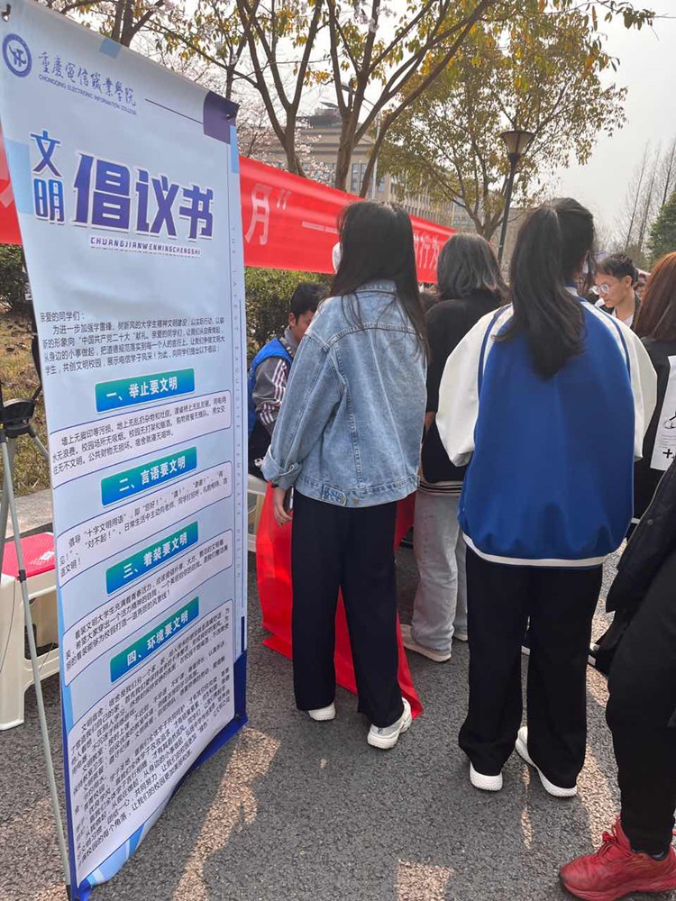 二是青年志愿者组织开展“告别不文明行为”签名活动,并向同学们发出积极践行《重庆市文明行为促进条例》倡议,倡导“我排队、我礼让、我快乐”的理念,争做文明校园建设的宣传者、维护者、监督者。