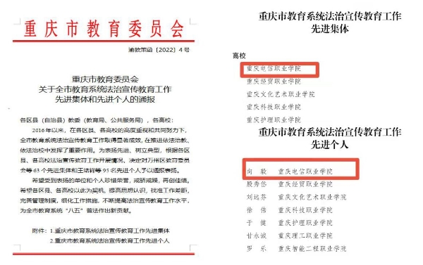 近日,获悉《重庆市教育委员会关于全市教育系统法治宣传教育工作先进集体和先进个人的通报》,KY开元荣获重庆市教育系统法治宣传教育工作先进集体,向毅同志荣获重庆市教育系统法治宣传教育工作先进个人荣誉称号。