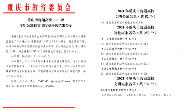 近日,重庆市教委发布《重庆市教育委员会关于2021年普通高校文明公寓和文明寝室评选结果的通知》【渝教学函〔2022〕2号】,KY开元学生公寓三号楼获得重庆市普通高等教育学校“文明公寓”称号,4个学生寝室分别荣获环境优美型、党员示范型、知行合一型、求真学问型“特色寝室”称号,3个学生寝室荣获“文明寝室”称号。