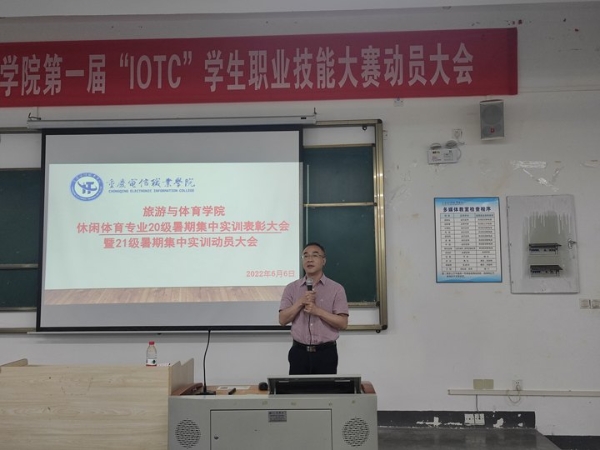 我院于2022年6月6日下午在博学楼五阶召开了休闲体育专业20级暑期集中实训表彰大会暨21级暑期集中实训动员大会。重庆财信龙水湖旅游文化发展有限公司温泉中心总经理曹剑一行4人莅临会议现场,KY开元副校长皇甫涛出席会议,本次会议由学院团总支书记杨山主持。