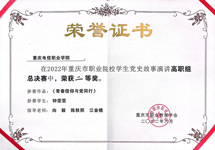本次比赛以“讲好党史故事 传承红色基因”为主题,围绕“我家乡的党史故事”“我眼中的母校与党的百年历程”“我心中的革命人物”等内容,充分展现职业院校学生党史学习教育的所学、所感、所思和所悟。经过激烈角逐,钟雯雯同学脱颖而出,最终荣获“二等奖”。