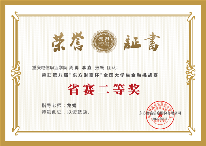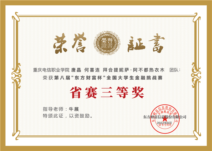 经过为期一个多月的激烈角逐,由中共青团中央青年发展部主办,东方财富信息股份有限公司、全国学校共青团研究中心承办的2022年第八届“东方财富杯”全国大学生金融挑战赛落下帷幕。在学校及学院领导的关心关怀下,由教师龙娟、张琴、牛展指导的金融服务与管理专业2020级学生王琳玲、徐远煜、张艳群代表队荣获省赛“一等奖”,2019级周勇、李鑫、张杨代表队荣获省赛“二等奖”、2020级何央行、郑雨婷、曾静代表队和蒙威、何央行、欧阳秋雨代表队荣获省赛“三等奖”,2021级徐兴豪、刘安波、杨力燕代表队荣获省赛“三等奖”,2021级唐晶、何喜连、拜合提妮萨.阿不都热衣木代表队荣获省赛“三等奖”。