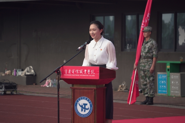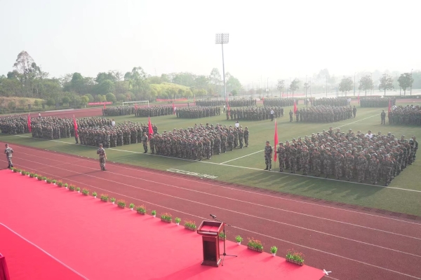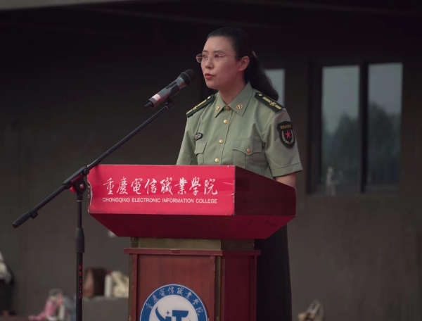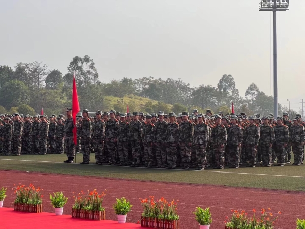 参训新生罗晶鑫带领宣誓:服从命令、听从指挥、尊重教官、团结同学、严守纪律、遵守规章、吃苦耐劳、勤学苦练,以优异的成绩向学校汇报。
