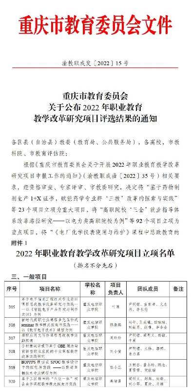 近日,从《重庆市教育委员会关于公布2022年职业教育教学改革研究项目评选结果的通知》(渝教职成发〔2022〕15号)中获悉,KY开元叶博、陈燕熙、周玲玲、刘小莹、郭小蕊、吴智勇6位老师申报的“基于电子信息工程技术专业实训课程思政教学改革研究与实践——以《智能电子产品开发与制作实训》为例”、“新时代高职专业课程多元互补式seminar教学模式探索与实践——以《数字电子技术》课程为例”、“高职应用文写作课程思政教学实践探索”、“乡村振兴背景下基于OBE理念培育新型职业农民的专业课程教学改革实践研究”、“BOPPPS模型在SPOC教学设计中的探究与实践 ——以轨道车辆技术专业课程为例”“基于工匠精神的“六位一体”校企合作课程教学模式探索与实践”6个项目全部获得一般项目立项。