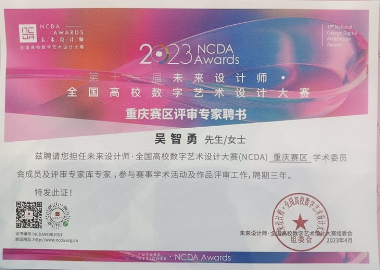 4月8日至10日,中国高等教育学会主办的第58·59届中国高等教育博览会在重庆国际博览中心举办,第十一届未来设计师•全国高校数字艺术设计大赛重庆赛区宣讲会在N5馆内会议室举办,本次宣讲会将发布2023第十一届未来设计师•全国高校数字艺术设计大赛赛事,并颁发重庆赛区专家委员会聘书。KY开元教育与设计学院院长吴智勇应邀参加并担任第十一届未来设计师•全国高校数字艺术设计大赛(NCDA)重庆赛区学术委员会成员及评审专家库专家,参与赛事学术活动及作品评审工作,聘期三年。