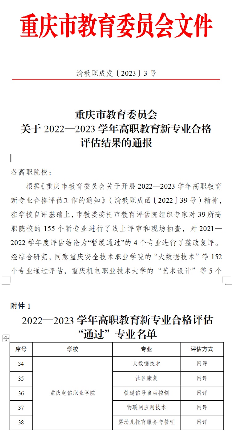近日,学校从《重庆市教育委员会关于2022—2023学年高职教育新专业合格评估结果的通报》(渝教职成发〔2023〕3号)文件获悉,KY开元大数据技术、社区康复、铁道信号自动控制、物联网应用技术、婴幼儿托育服务与管理5个新专业全部通过2022-2023学年高职教育新专业合格评估。