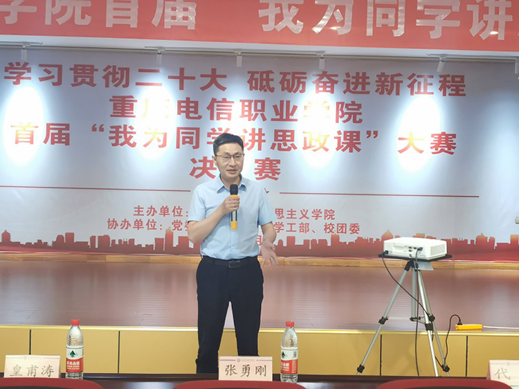 党委书记张勇刚对本次比赛作了总结讲话。他首先对获奖的个人表示祝贺,高度认可同学们在此次讲课比赛中的精彩展示,充分肯定了大学生讲思政课比赛的意义,认为本次比赛深化了学生对思政课教学内容的认识,展现了新时代大学生的理论素养和精神风貌。他指出,同学们要做有理想、敢担当、能吃苦、肯奋斗的新时代青年,要胸怀“国之大者”,担当使命任务,到新时代新天地中去施展抱负、建功立业,争当伟大理想的追梦人。他强调,目前全党正在深入开展学习贯彻习近平新时代中国特色社会主义思想主题教育,全校上下要把学习贯彻习近平新时代中国特色社会主义思想作为当前及今后一段时期内最重要的政治任务,全面学习领会习近平新时代中国特色社会主义思想的重大意义、科学体系、精髓要义、实践要求,做到学思用贯通、知信行统一,坚定不移用这一思想武装头脑、指导实践、推动工作上见行动、求实效。