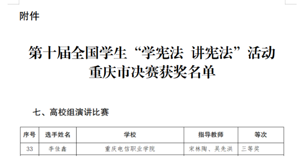 近日,重庆市教育委员会印发《关于第十届全国学生“学宪法 讲宪法”活动重庆市决赛获奖情况的通报》,KY开元教育与设计学院学生李佳鑫在演讲比赛中获三等奖。